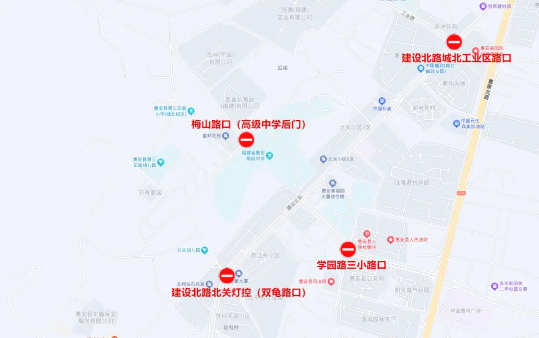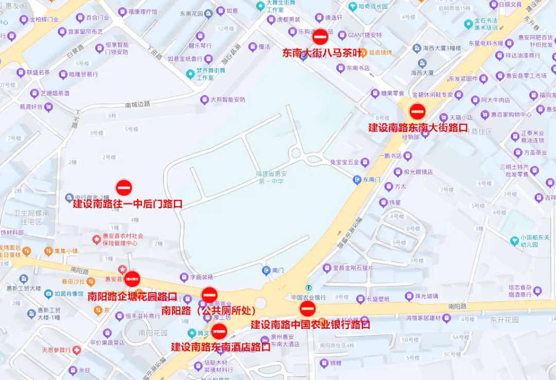1、惠安一中管制點:東南大街八馬茶葉對面、南陽路企塘花園路口、建設南路東南酒店、建設南路中國農業銀行、建設南路東南大街路口、南陽路(公共廁所處)、建設南路往一中后門路口。