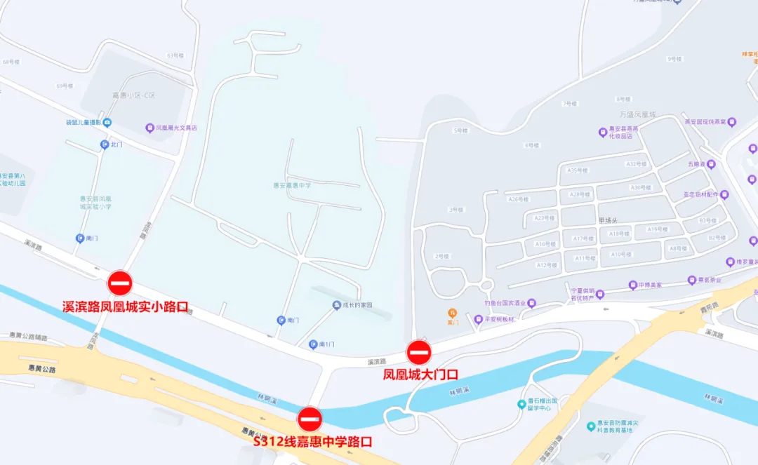 4、嘉惠中學管制點:S312線嘉惠中學路口、鳳凰城大門口、溪濱路鳳凰城實小路口。