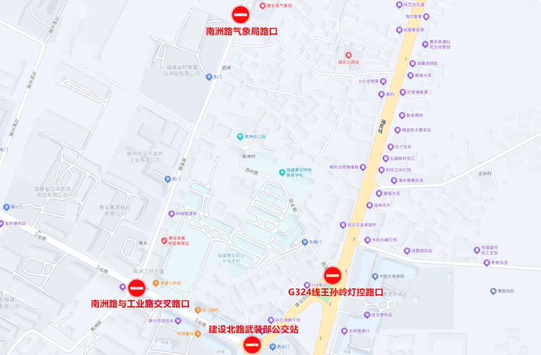 5、惠安職專管制點:G324線王孫嶺燈控路口、建設北路武裝部公交站、南洲路氣象局路口、南洲路與工業路交叉路口。