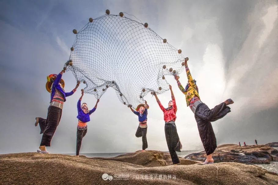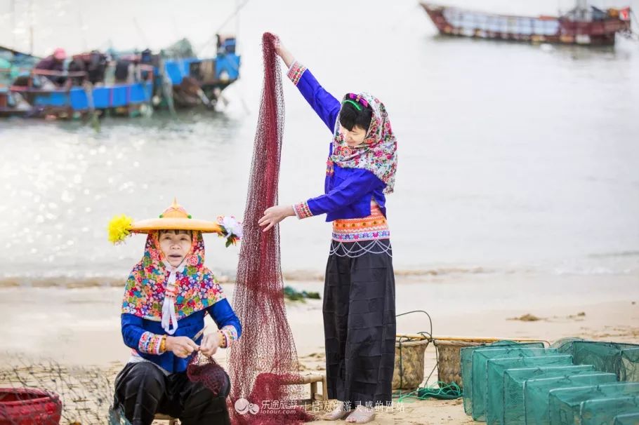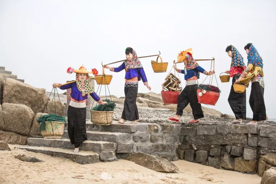 她們喜好五色,藍(lán)、黑、黃、綠、紅是她們的五種主打色。對(duì)應(yīng)中國(guó)元素的五行。藍(lán)是藍(lán)色的上衣,既與海水打成一片,又讓天空更為柔軟。黑是黑色的大折褲,讓腳踏的黑土地有實(shí)沉感,讓夜色并非漆黑一團(tuán),而是具有紋理的。黃是亮黃色的斗笠,是金色的陽(yáng)光與沙灘,是金黃的手鏈,是美好亮堂的生活。綠是草綠梳子,是翠綠花點(diǎn)頭巾,是“風(fēng)乍起,吹皺一池的春水”。紅是頭花,是腰帶,是蝴蝶結(jié),是袖口,是在貧瘠沙灘上也能開(kāi)出美麗花朵的月見(jiàn)草。
