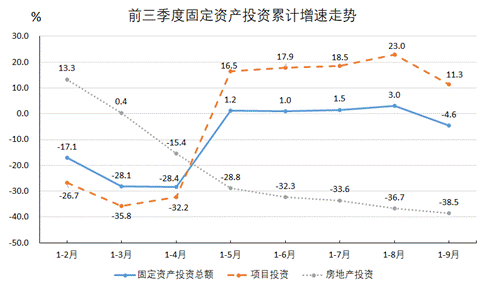 --項目建設進度放緩,固投呈波動性恢復。固投在連續(xù)3個月大幅下降后,5月開始止跌回升,同比增長1.2%,在持續(xù)4個月增速提升后,9月增速由升轉降,同比下降20.0%。前三季度,全縣累計完成固定資產投資147.95億元,同比下降4.6%,增幅比1-8月下降7.6個百分點,但與一季度比提升了23.5個百分點。分投資類別看:項目投資進度放緩,前三季度,全縣項目投資同比增長11.3%,增幅比1-8月下降11.7個百分點;房地產開發(fā)投資同比下降38.5%,拉低全縣固定資產投資增長12.3個百分點。