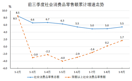 --消費活力持續(xù)釋放,商品銷售穩(wěn)步恢復。全縣消費品零售呈現出高開低走、企穩(wěn)回升態(tài)勢。1-2月全縣消費品零售總額以8.5%的增速開局,隨后一路下行,到8月份累計增速降至5.0%, 9月零售額同比增長9.0%,前三季度累計增長5.5%,與上半年基本持平,其中限額以上商品零售額增長趨勢與全縣零售總額走勢基本一致,以8.5%的增速開局,隨后下行至1-5月累計下降4.0%,下半年隨著一系列促消費舉措推出,消費市場逐漸回暖,增幅逐漸收窄,8月開始止跌回升累計增長0.2%,前三季度累計增長1.7%,比全市平均水平高1.8個百分點,居全市第5位。