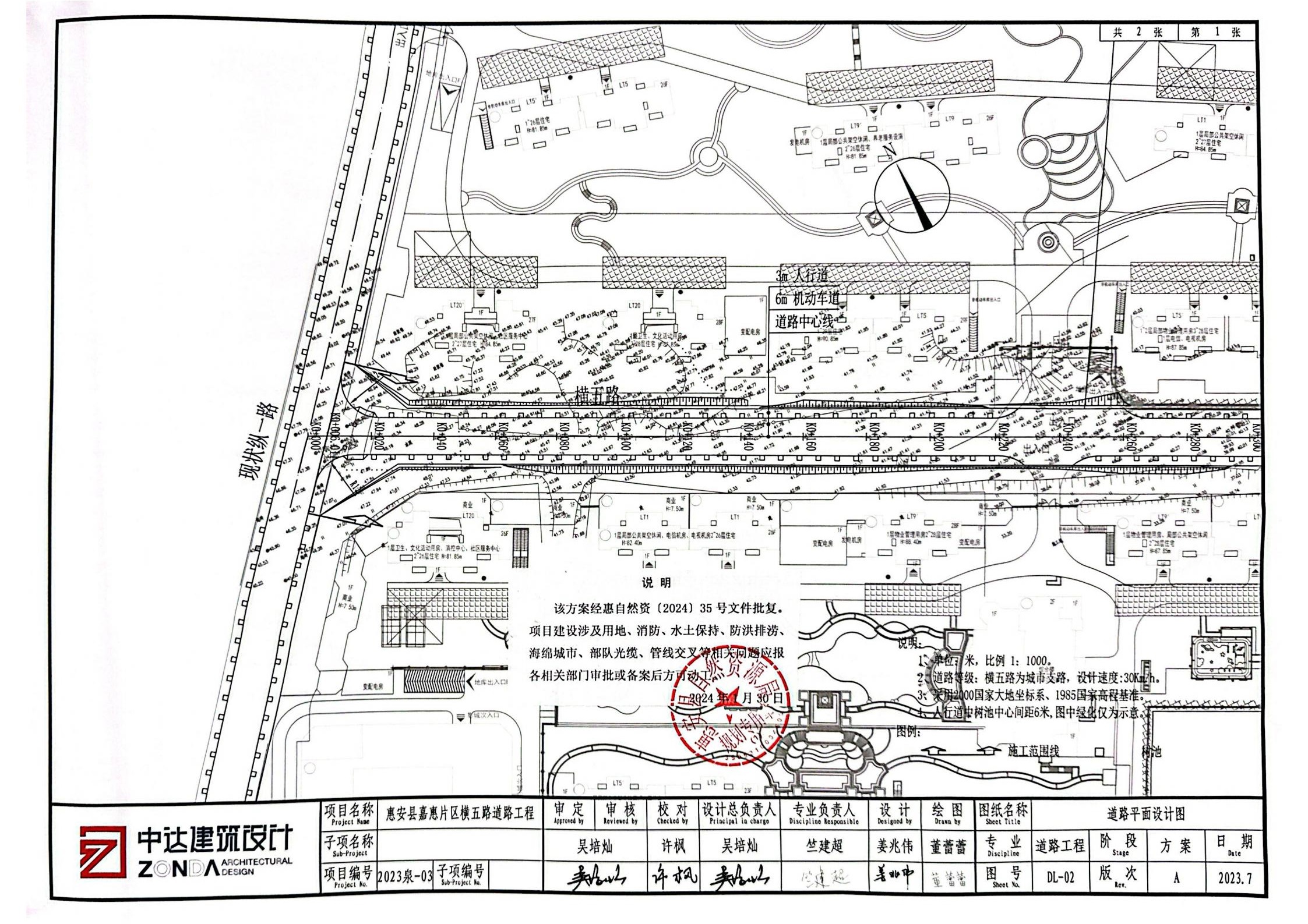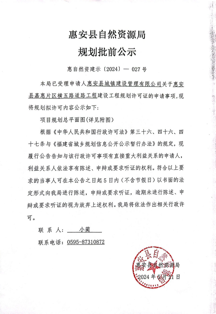 惠安縣嘉惠片區橫五路道路工程建設工程規劃許可證批前公示